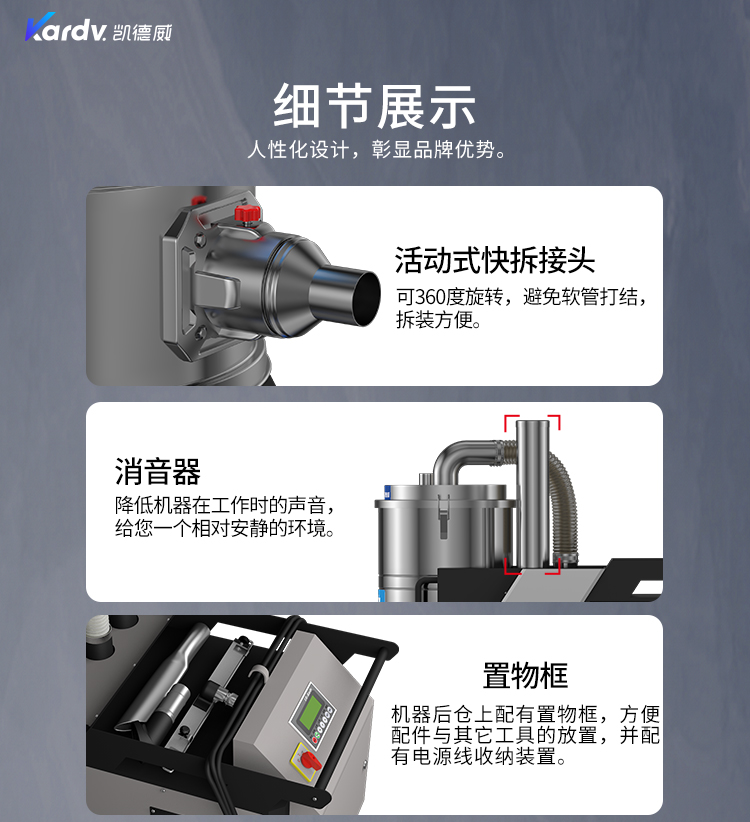 SK - F系列是我司自主研發的智能型工業吸塵器。具有以下六大亮點: A.整機采用工業設計風格,外形剛勁有力,做工精良美觀。 B.集塵桶固定把手設計。C.采用直徑160mm的TPE靜音前后大輪 D.電控系統采用凱德威自主設計帶有液晶顯示屏的智能PLC電控控制系統 E.動力源采用凱德威FY系列定制主機,并選用NSK耐高溫防塵軸承。 F.全自動電子反吹清灰系統具有人工免保養,吸力強勁、穩定,故障率低。 G.集塵系統采用100L不銹鋼材質的上下分離桶,桶壁光滑易清理。