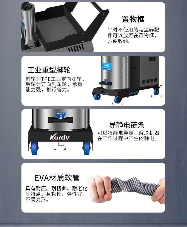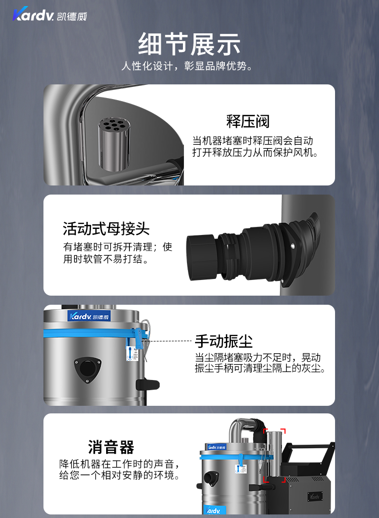 SK-710是一款自主研發(fā)的工業(yè)吸塵器。采用工業(yè)設(shè)計風(fēng)格,做工精美,外觀大氣,黑灰色調(diào)搭配彰顯本機的工業(yè)風(fēng)格。電控系統(tǒng)采用簡單易操作的按鍵式控制系統(tǒng),有防缺相,漏電,過載的保護。動力源采用凱德威FY4.0定制主機,葉片以及外殼為合金材料壓鑄成型,再經(jīng)過整體拋光噴涂,相對控制了整機的熱脹冷縮,風(fēng)量穩(wěn)定,并選用了質(zhì)量穩(wěn)定的軸承。