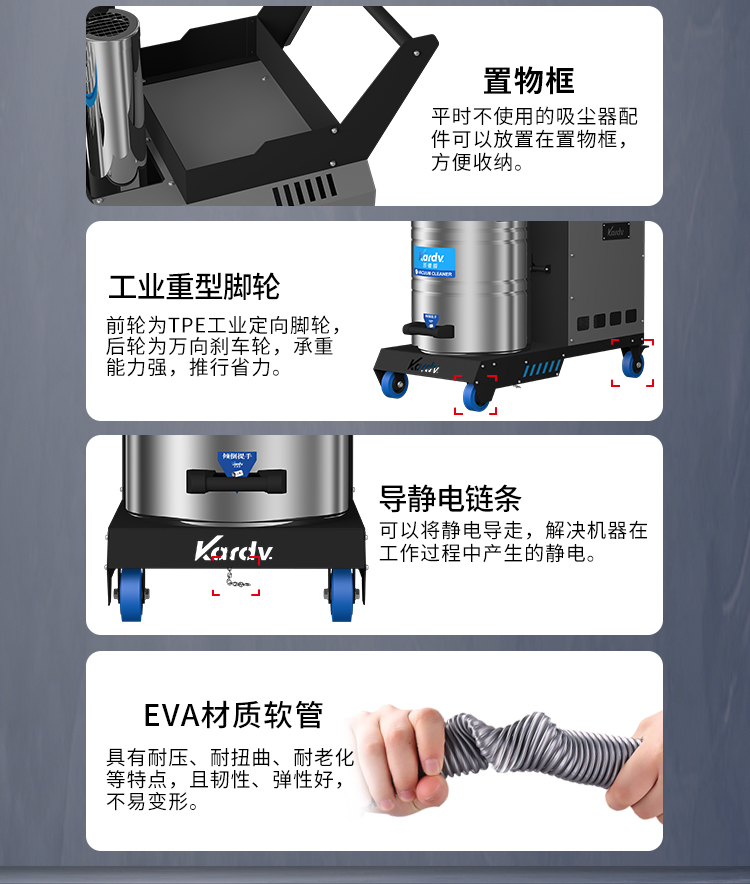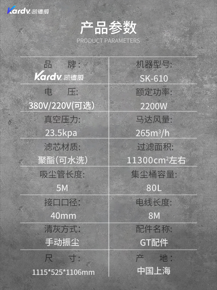 SK-610是一款自主研發的工業吸塵器。采用工業設計風格,做工好,美觀大氣,黑灰色調搭配彰顯本機的工業風格。電控系統采用簡單易操作的按鍵式控制系統,有防缺相,漏電,過載的保護。動力源采用凱德威FY2.2定制主機,主機葉片以及外殼為合金材料壓鑄成型,再經過整體拋光噴涂,相對控制了整機的熱脹冷縮,風量穩定,并選用了質量穩定的軸承。