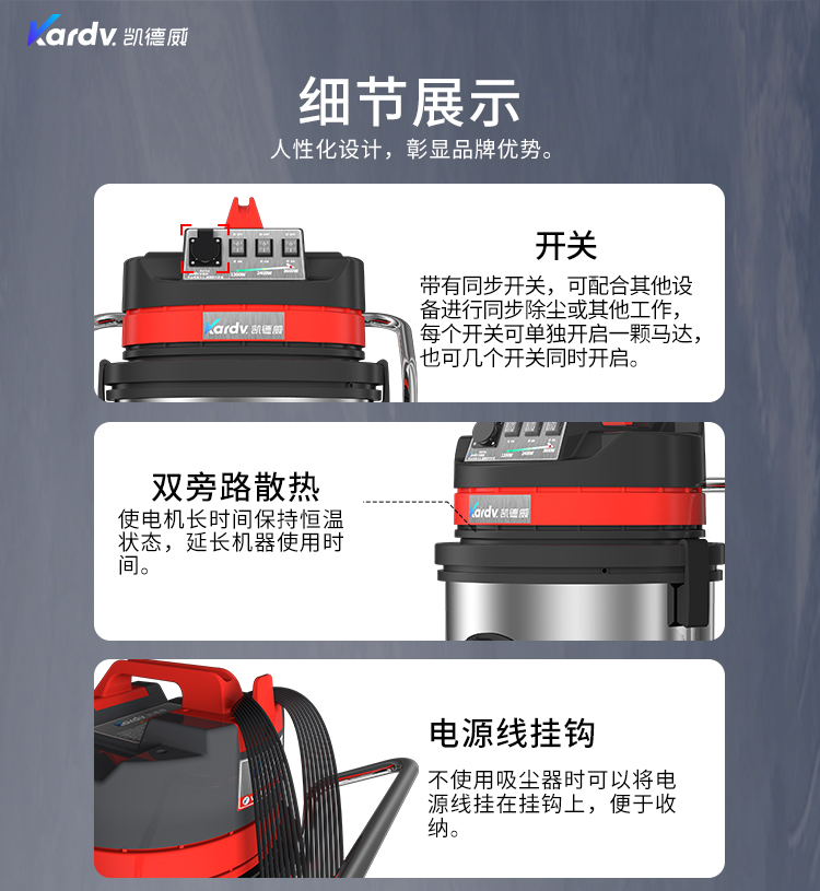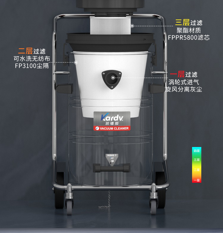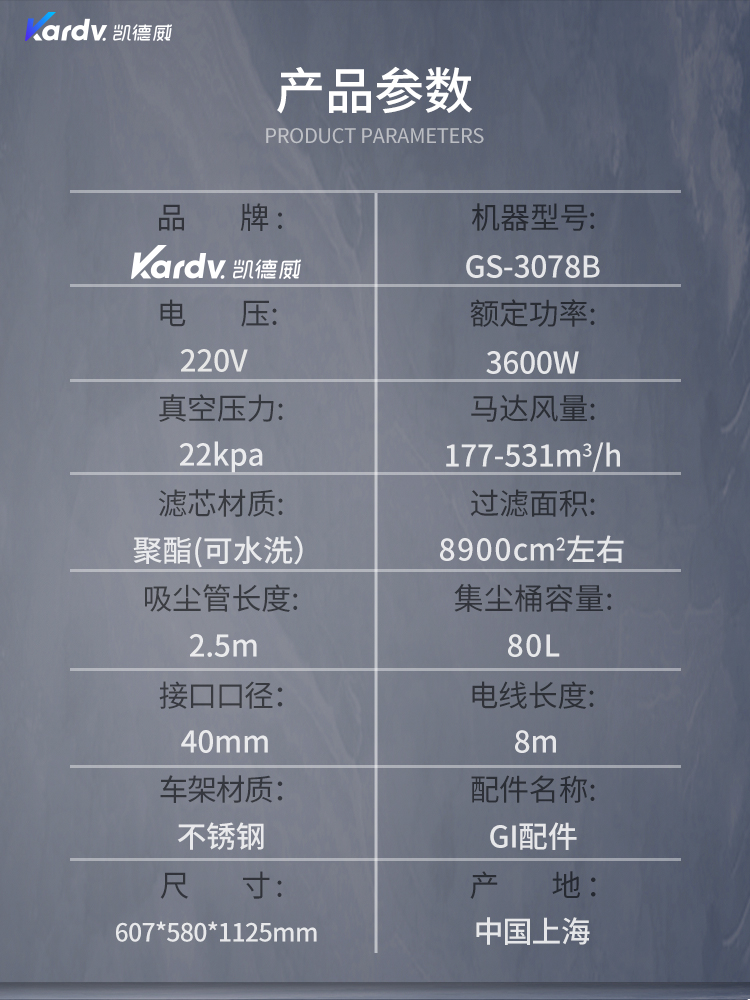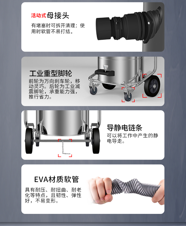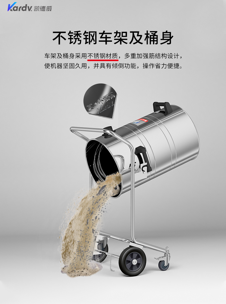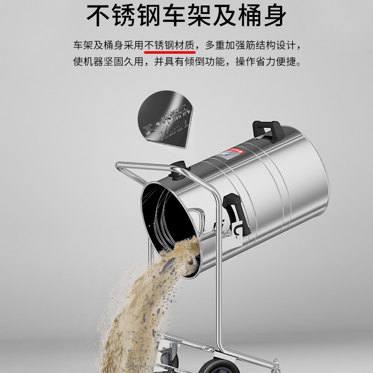 GS-3078B是一款工業型吸塵器,集塵桶為80L,為不銹鋼材質,配有不銹鋼車架,在移動時輕巧方便;可以用在工廠、倉庫或建筑工地等場所清理灰塵等,在商業環境中也可以使用。