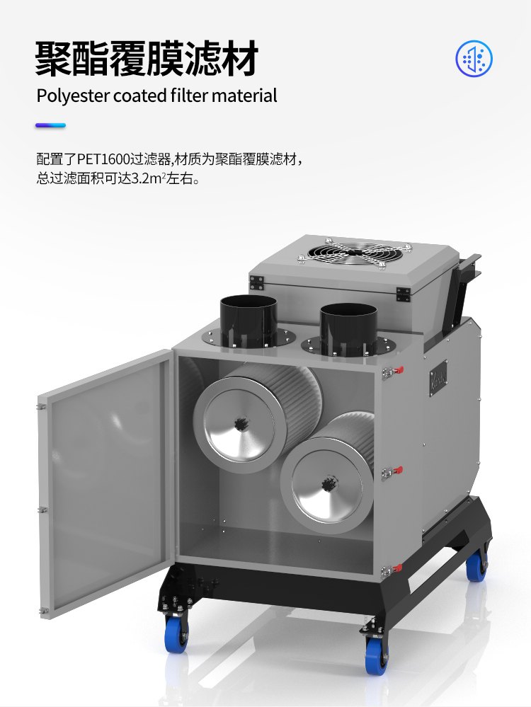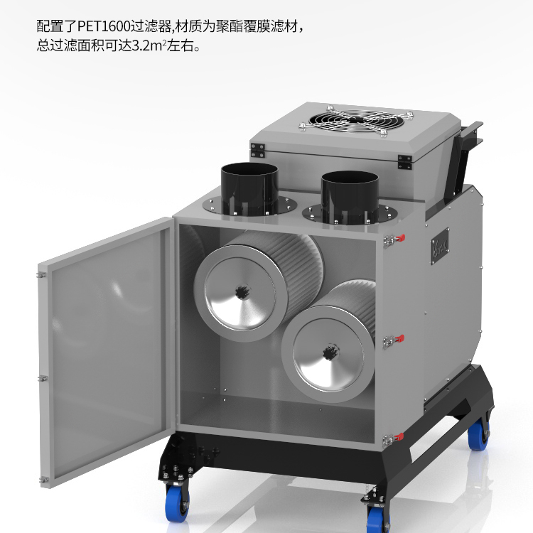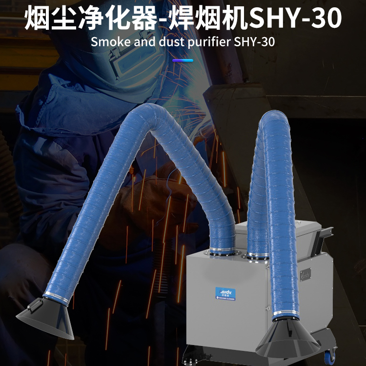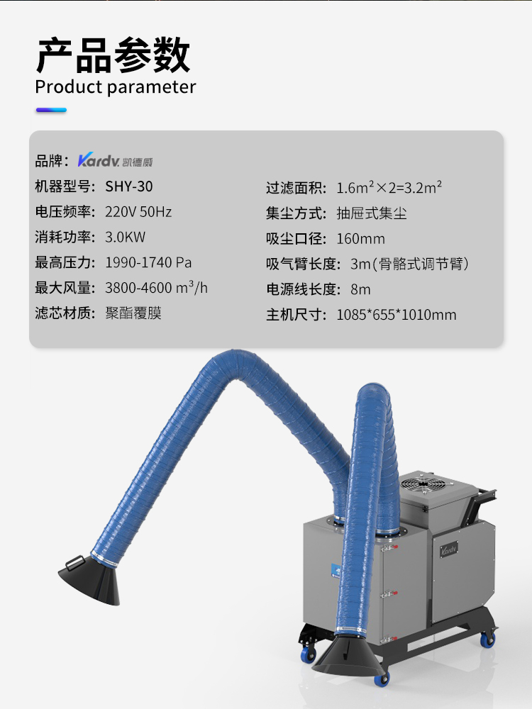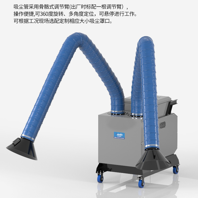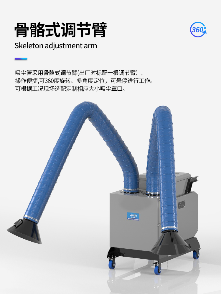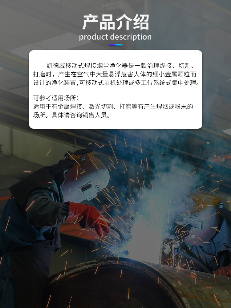 金屬焊接、激光切割、打磨作業時,大量煙塵懸浮在車間內,被吸入人體肺部影響身體健康,因此在焊接煙塵進入焊工呼吸區前把這些煙塵進行凈化處理。凱德威移動式焊接煙塵凈化器是一款治理焊接、切割、打磨時,產生在空氣中大量懸浮危害人體的細小煙塵顆粒而設計的凈化裝置,可移動式單機處理或多工位系統集中式處理。配有1根2.5米長的吸氣臂,在不同的工作地點移動靈活,操作方便。